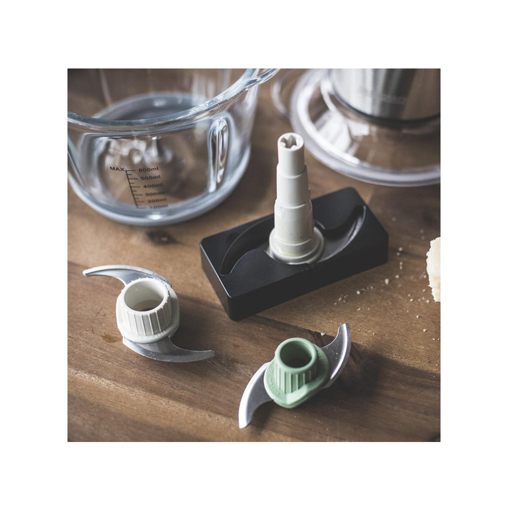 جنس مخزن این دستگاه خردکن پیرکس نشکن می باشد و گنجایش 1.2 لیتر دارد. تعداد نیغه هایی که در این دستگاه به کار رفته جنس استیل ضد زنگ داشته و 6 تیه 2 پره بوده که فوق العاده قوی هستند که میتوانید برای خرد کردن هویج، خیار، سیب زمینی، گوشت و یا مرغ نیز از آن استفاده کنید. همچنین این تیغه ها به راحتی جدا شده و میتوانید تیغه ها مخزن شیشه ای را به راحتی در ماشین ظرف شویی بشورید.